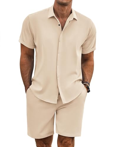 COOFANDY Men's Summer Beach Outfits 2 Piece Short Sleeve Shirts and Shorts Vacation Texture Linen Sets for Men