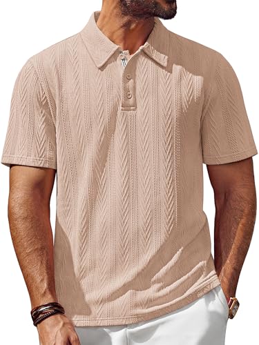 Mens polo shirts short sleeve features classic polo collar with 3 buttons, contrast color under placket, unique and fashion knitted pattern textured, adding a touch of sophistication, giving a modern and stylish look.